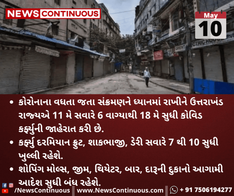 કોરોનાના વધતા જતા સંક્રમણને ધ્યાનમાં રાખીને ઉત્તરાખંડ રાજ્યએ 11 મે સવારે 6 વાગ્યાથી 18 મે સુધી કોવિડ કર્ફ્યુની જાહેરાત કરી છે