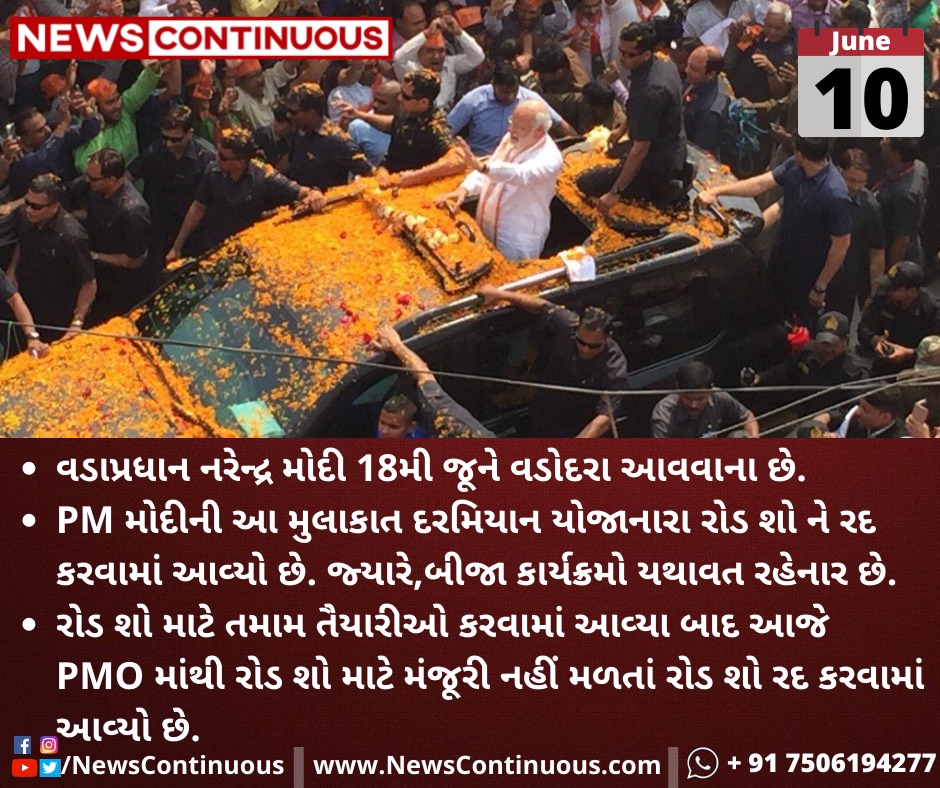 વડાપ્રધાન નરેન્દ્ર મોદી(Prime Minister Narendra Modi) 18મી જૂને વડોદરા(Vadodara) આવવાના છે.