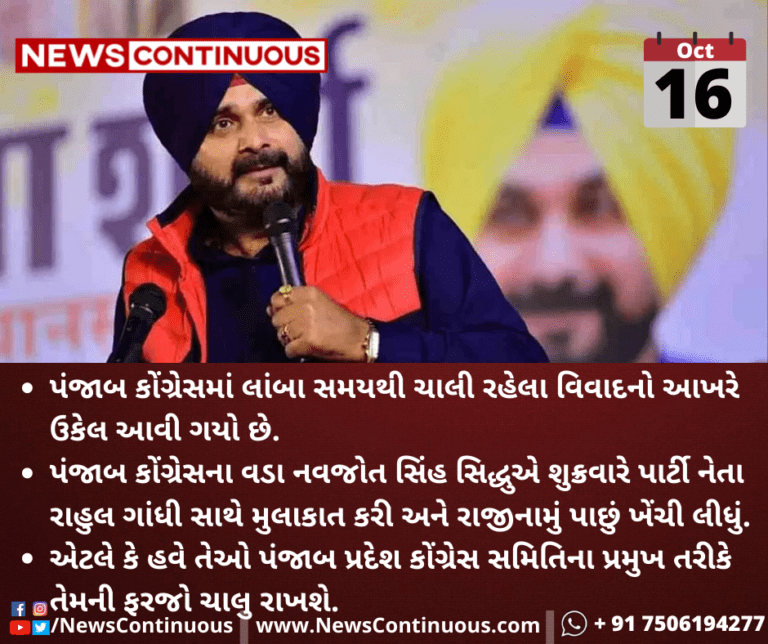 ઉલ્લેખનીય છે કે 28 સપ્ટેમ્બરના રોજ નવજોત સિંહ સિદ્ધુએ પંજાબ કોંગ્રેસના અધ્યક્ષ પદેથી રાજીનામું આપી દીધું હતું. જોકે તેમનું રાજીનામું પાર્ટી નેતૃત્વ દ્વારા સ્વીકારવામાં આવ્યું ન હતું