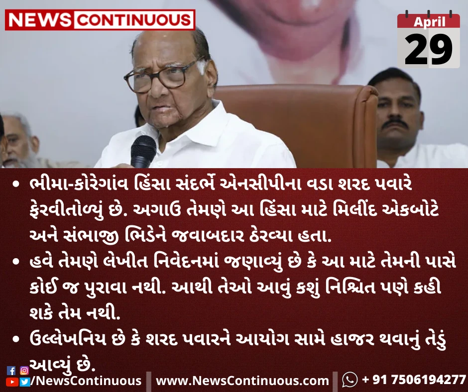 ભીમા-કોરેગાંવ હિંસા(Bhima-Koregaon violence) સંદર્ભે એનસીપીના(NCP) વડા શરદ પવારે(Sharad Pawar) ફેરવીતોળ્યું છે. અગાઉ તેમણે આ હિંસા માટે મિલીંદ એકબોટે(Milind Ekbote) અને સંભાજી ભિડેને(Sambhaji Bhide) જવાબદાર ઠેરવ્યા હતા.
