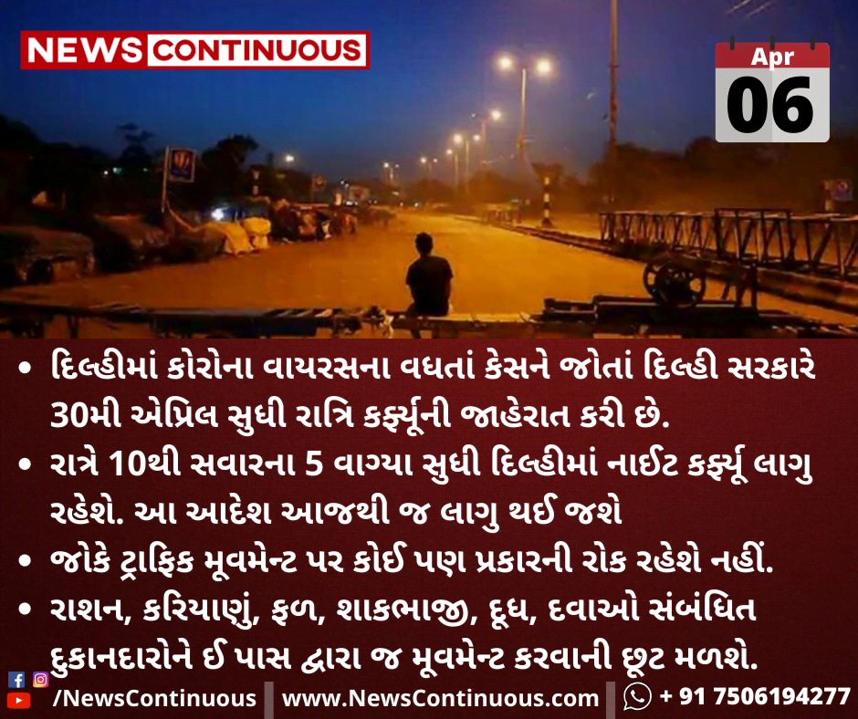 દિલ્હીમાં કોરોના વાયરસના વધતાં કેસને જોતાં દિલ્હી સરકારે 30મી એપ્રિલ સુધી રાત્રિ કર્ફ્યૂની જાહેરાત કરી છે.