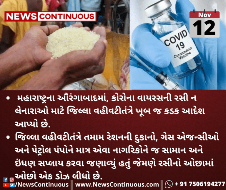 મહારાષ્ટ્રના ઔરંગાબાદમાં, કોરોના વાયરસની રસી ન લેનારાઓ માટે જિલ્લા વહીવટીતંત્રે ખૂબ જ કડક આદેશ આપ્યો છે.