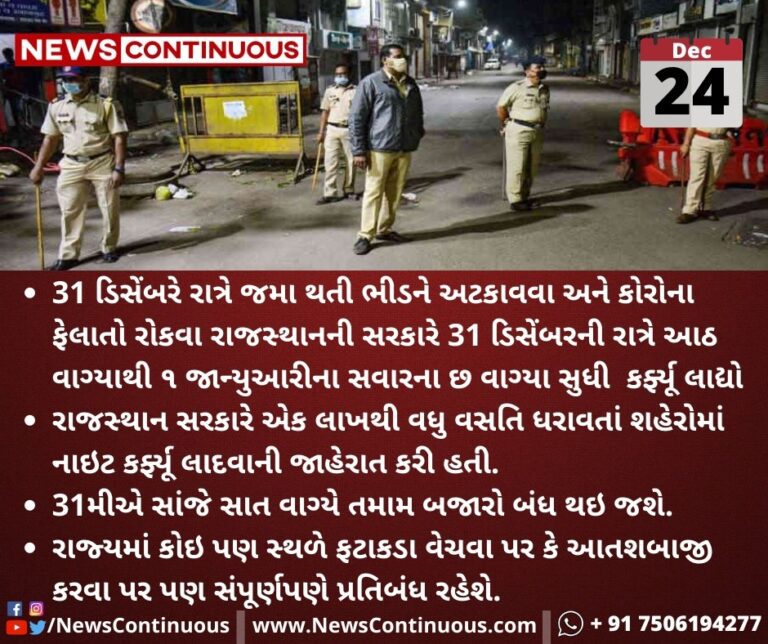 - 31 ડિસેંબરે રાત્રે જમા થતી ભીડને અટકાવવા અને કોરોના ફેલાતો રોકવા રાજસ્થાનની સરકારે 31 ડિસેંબરની રાત્રે આઠ વાગ્યાથી ૧ જાન્યુઆરીના સવારના છ વાગ્યા સુધી કર્ફ્યૂ લાદ્યો