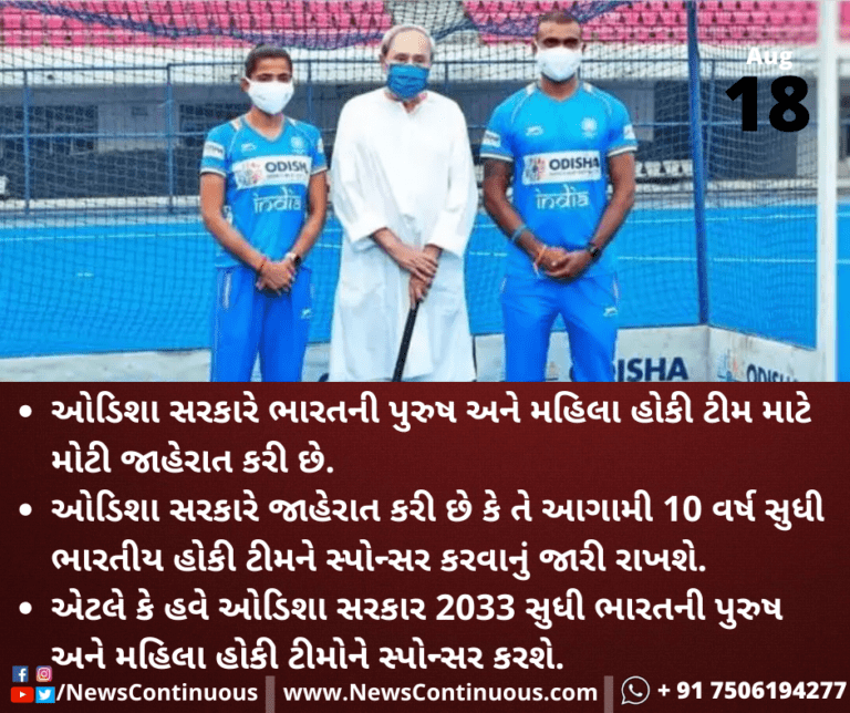 ઓડિશા સરકાર જાહેરાત કરી છે કે તે આગામી 10 વર્ષ સુધી ભારતીય હોકી ટીમને સ્પોન્સર કરવાનું જારી રાખશે.