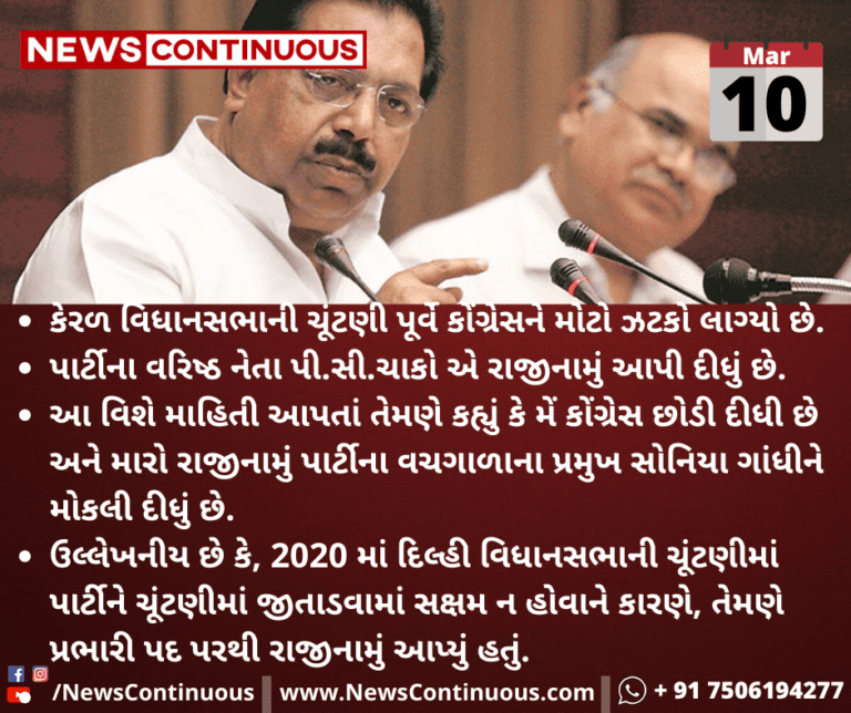 કેરળ વિધાનસભાની ચૂંટણી પૂર્વે કોંગ્રેસને મોટો ઝટકો લાગ્યો છે. પાર્ટીના વરિષ્ઠ નેતા પી.સી.ચાકો એ રાજીનામું આપી દીધું છે.