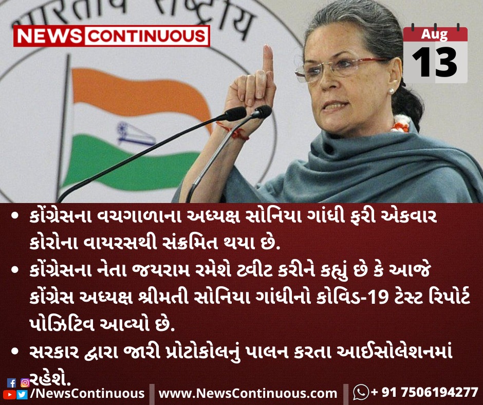 કોંગ્રેસના (Congress) વચગાળાના અધ્યક્ષ સોનિયા ગાંધી(President Sonia Gandhi) ફરી એકવારકોરોના વાયરસથી(corona virus) સંક્રમિત થયા છે.