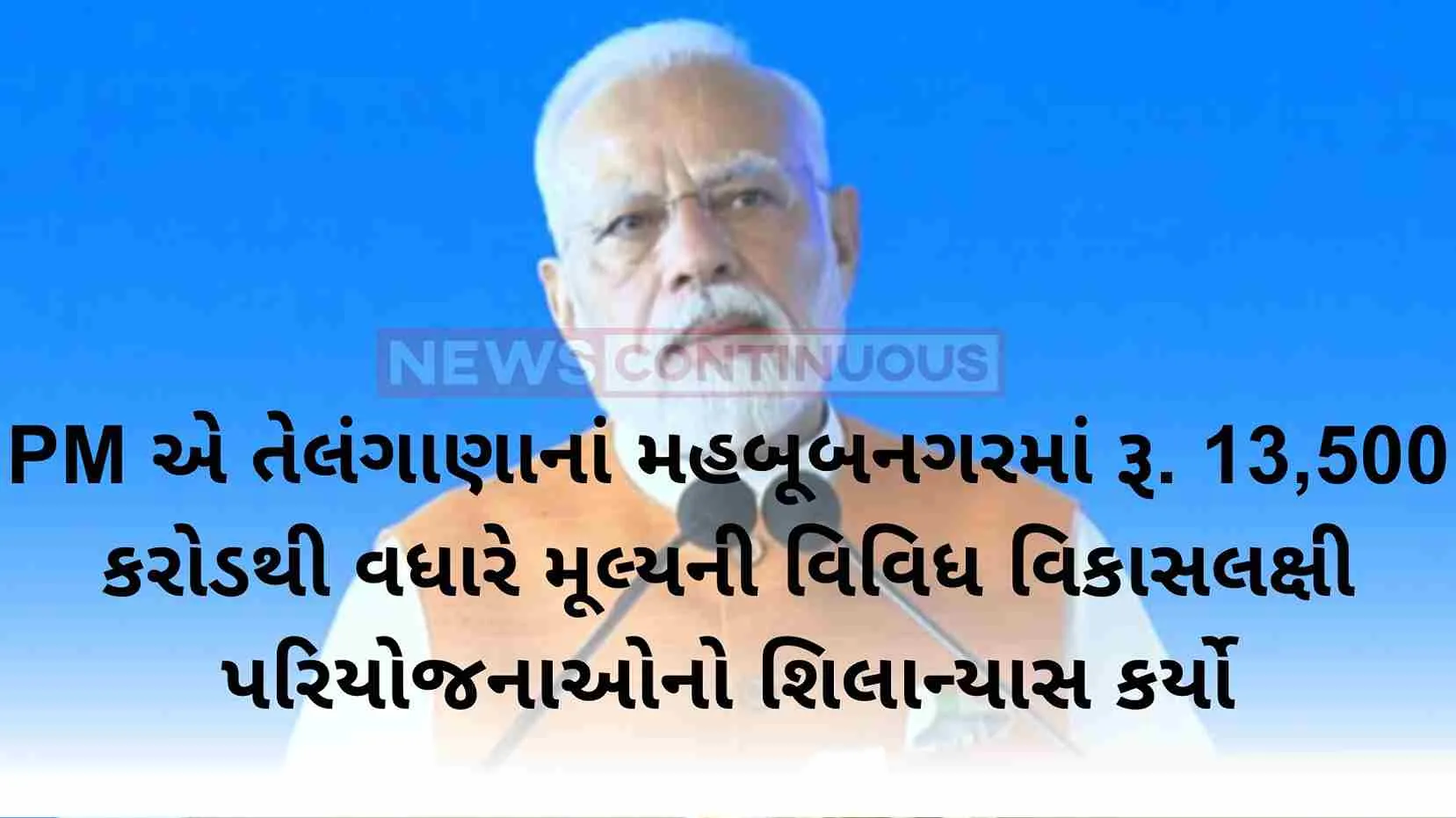 પ્રધાનમંત્રી શ્રી નરેન્દ્ર મોદીએ(PM Modi) આજે તેલંગાણાનાં મહબૂબનગરમાં(Mahbubnagar) રૂ. 13,500 કરોડથી વધારે મૂલ્યની વિવિધ વિકાસલક્ષી પરિયોજનાઓનો શિલાન્યાસ કર્યો હતો અને દેશને સમર્પિત કરી હતી. વિકાસ યોજનાઓમાં માર્ગ, રેલ, પેટ્રોલિયમ અને કુદરતી ગેસ અને ઉચ્ચ શિક્ષણ જેવા મહત્વપૂર્ણ ક્ષેત્રોનો સમાવેશ થાય છે. કાર્યક્રમ દરમિયાન પ્રધાનમંત્રીએ વીડિયો કોન્ફરન્સિંગ મારફતે એક ટ્રેન સેવાને પણ લીલી ઝંડી આપી હતી.