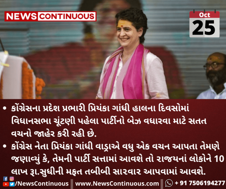 કોંગ્રેસ નેતા પ્રિયંકા ગાંધી વાડ્રાએ વધુ એક વચન આપતા તેમણે જણાવ્યું કે, તેમની પાર્ટી સત્તામાં આવશે તો ૨ાજયનાં લોકોને 10 લાખ રૂા.સુધીની મફત તબીબી સા૨વા૨ આપવામાં આવશે.