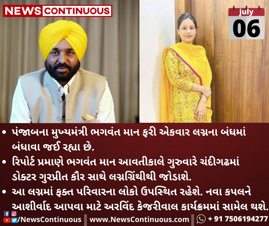 રિપોર્ટ પ્રમાણે ભગવંત માન આવતીકાલે ગુરુવારે ચંદીગઢમાં(Chandigarh) ડોક્ટર ગુરપ્રીત કૌર(Doctor Gurpreet Kaur) સાથે લગ્નગ્રિંથીથી જોડાશે.