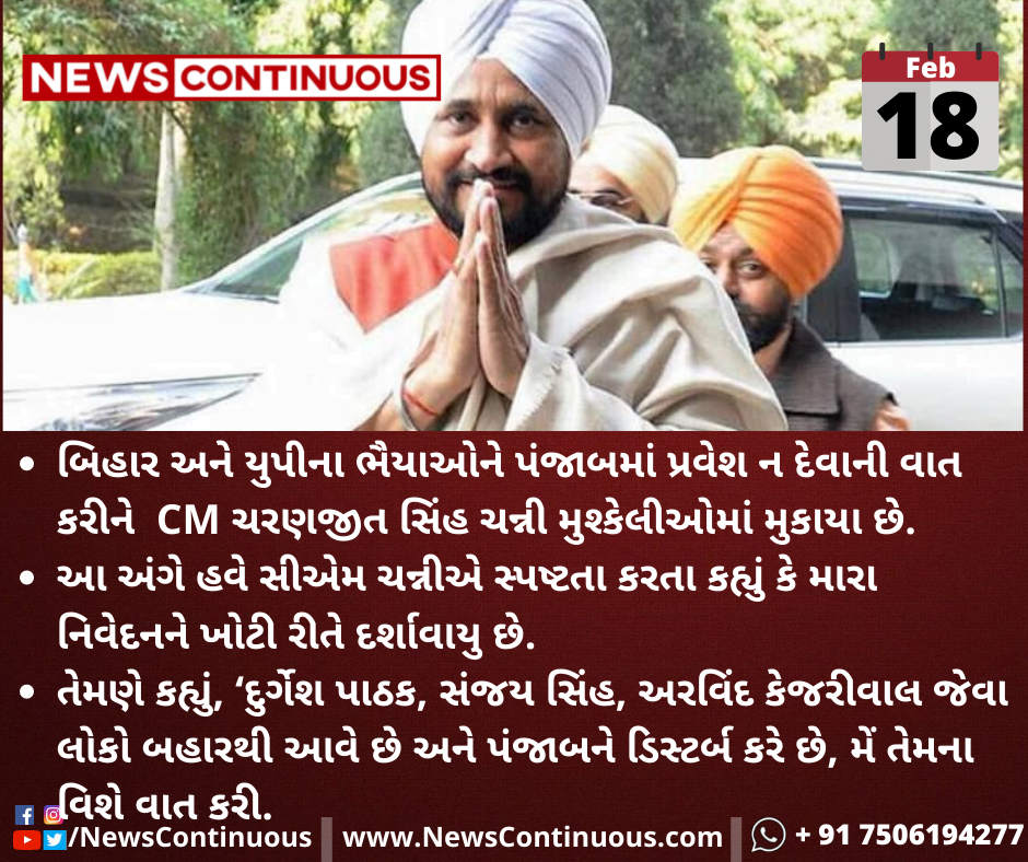 ગત થોડા દિવસ અગાઉ સીએમ ચન્નીએ એક રેલીમાં કહ્યુ હતુ કે, પંજાબીઓ એક થઈ જાવ અને યુપી, બિહાર તેમજ દિલ્હીના ભૈયાઓ અહીંયા રાજ કરવા માંગે છે તેમને નજીક પણ ના આવવા દેતા.