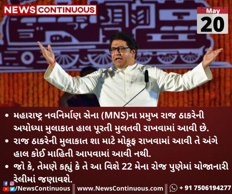 મહારાષ્ટ્ર નવનિર્માણ સેના (MNS)ના પ્રમુખ રાજ ઠાકરેની(raj Thackeray) અયોધ્યા મુલાકાત(Ayodhya Visit) હાલ પૂરતી મુલતવી રાખવામાં આવી છે.
