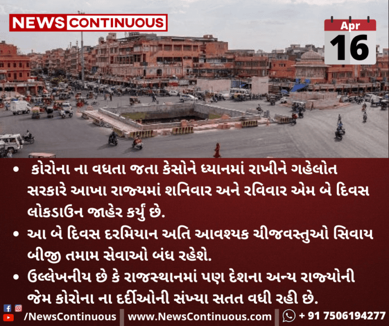 કોરોના ના વધતા જતા કેસોને ધ્યાનમાં રાખીને ગહેલોત સરકારે આખા રાજ્યમાં શનિવાર અને રવિવાર એમ બે દિવસ લોકડાઉન જાહેર કર્યું છે
