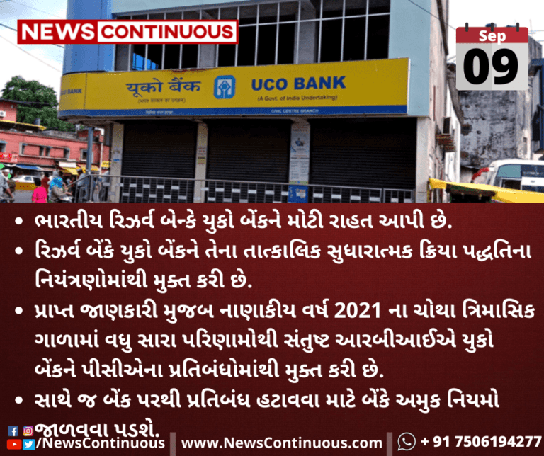 પ્રાપ્ત જાણકારી મુજબ નાણાકીય વર્ષ 2021 ના ચોથા ત્રિમાસિક ગાળામાં વધુ સારા પરિણામોથી સંતુષ્ટ આરબીઆઈએ યુકો બેંકને પીસીએના પ્રતિબંધોમાંથી મુક્ત કરી છે.