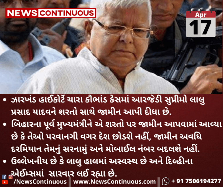 બિહારના પૂર્વ મુખ્ય પ્રધાનને એવી શરતો પર જામીન આપવામાં આવ્યા છે કે તેઓ પરવાનગી વગર દેશ છોડશે નહીં, જામીન અવધિ દરમિયાન તેમનું સરનામું અને મોબાઈલ નંબર બદલશે નહીં.