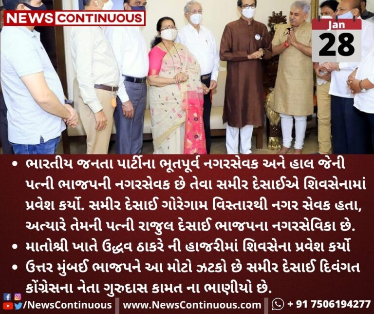 ભારતીય જનતા પાર્ટીના ભૂતપૂર્વ નગરસેવક અને હાલ જેની પત્ની ભાજપની નગરસેવક છે તેવા સમીર દેસાઈએ શિવસેનામાં પ્રવેશ કર્યો છે.