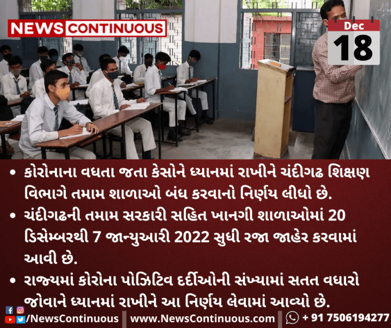 ચંદીગઢની તમામ સરકારી સહિત ખાનગી શાળાઓમાં આગામી 20 ડિસેમ્બરથી 7 જાન્યુઆરી 2022 સુધી રજા જાહેર કરવામાં આવી છે.