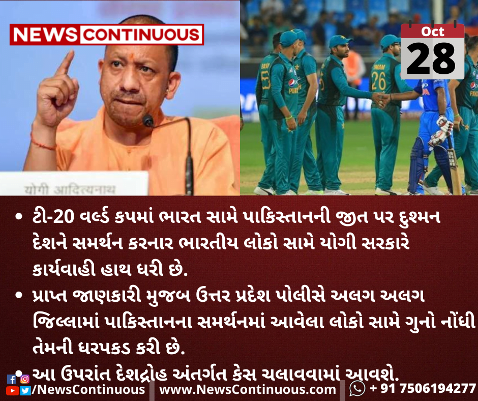 ટી-20 વર્લ્ડ કપમાં ભારત સામે પાકિસ્તાનની જીત પર દુશ્મન દેશને સમર્થન કરનાર ભારતીય લોકો સામે યોગી સરકારે કાર્યવાહી હાથ ધરી છે.