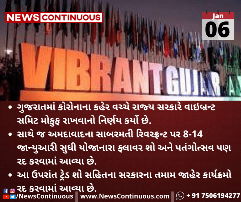 ગુજરાતમાં કોરોનાના કહેર વચ્ચે રાજ્ય સરકારે વાઇબ્રન્ટ સમિટ મોકુફ રાખવાનો નિર્ણય કર્યો છે.