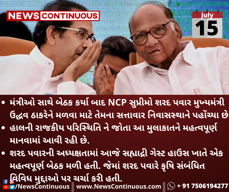 મંત્રીઓ સાથે બેઠક કર્યા બાદ NCP સુપ્રીમો શરદ પવાર મુખ્યમંત્રી ઉદ્ધવ ઠાકરેને મળવા માટે તેમના સત્તાવાર નિવાસસ્થાને પહોંચ્યા છે.
