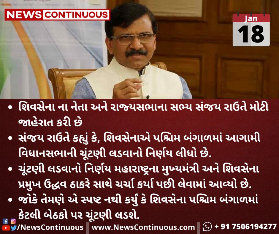 - સંજય રાઉતે કહ્યું કે, શિવસેનાએ પશ્ચિમ બંગાળમાં આગામી વિધાનસભાની ચૂંટણી લડવાનો નિર્ણય લીધો છે.