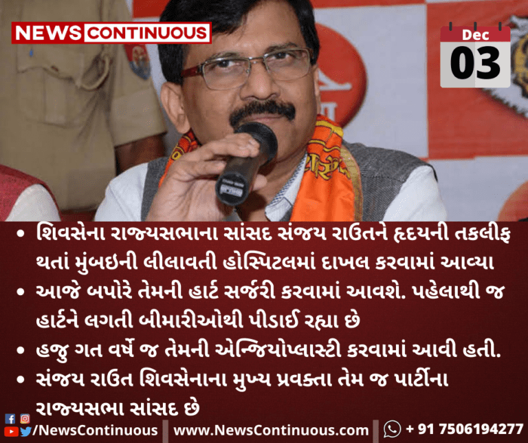 શિવસેના ના સાંસદ અને પ્રવક્તા સંજય રાઉત ની તબીયત ખરાબ થઈ. આજે હાર્ટ ઓપરેશન