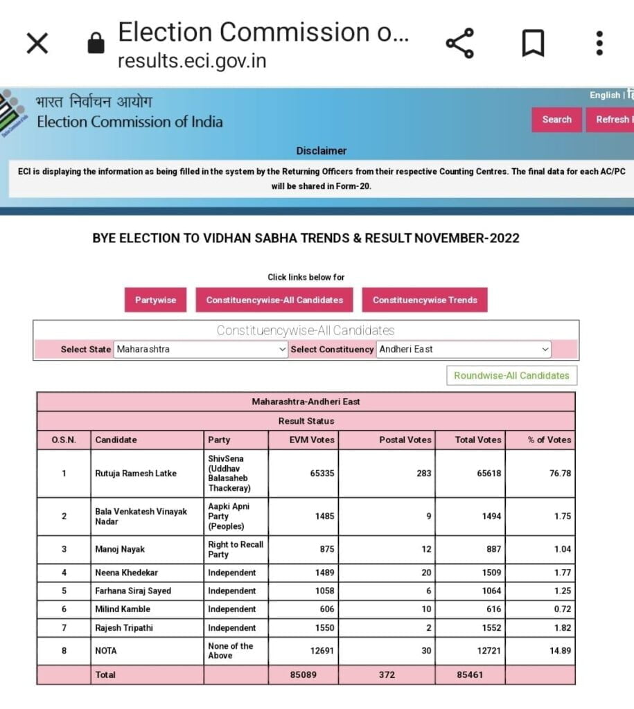 શિવસેના એ અંધેરી પૂર્વની પેટા ચૂંટણી જીતી લીધી છે. આ પેટા ચૂંટણીમાં માત્ર 31% મતદાન થયું હતું. મત ગણતરીના દરેક રાઉન્ડમાં શિવસેના સરસાઈ સાથે આગળ ચાલી રહી હતી. જોકે આની પાછળનું કારણ એ હતું કે શિવસેના સામે સક્ષમ ઉમેદવાર ચૂંટણી નહતો લડી રહ્યો. હવે જ્યારે ચૂંટણીના પરિણામ આવ્યા છે ત્યારે શિવસેના ને ૭૬% એટલે કે 65000 મત મળ્યા છે જ્યારે કે નોટા ને ૧૫% એટલે કે આશરે ૧૩ હજાર મત મળ્યા છે.