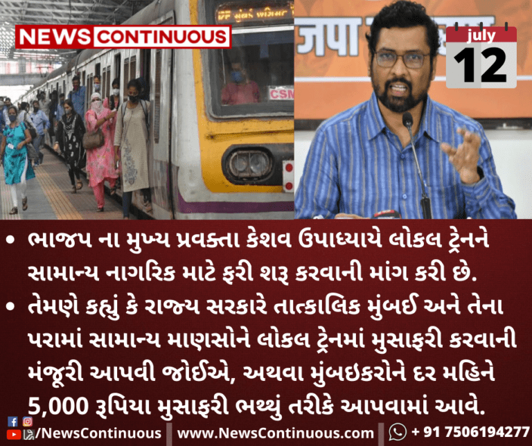ભાજપ ના મુખ્ય પ્રવક્તા કેશવ ઉપાધ્યાયે લોકલ ટ્રેનને સામાન્ય નાગરિક માટે ફરી શરૂ કરવાની માંગ કરી છે