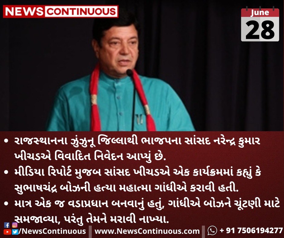 મીડિયા રિપોર્ટ મુજબ સાંસદ ખીચડએ એક કાર્યક્રમમાં કહ્યું કે સુભાષચંદ્ર બોઝની(Subhash Chandra Bose) હત્યા મહાત્મા ગાંધીએ(Mahatma Gandhi) કરાવી હતી.