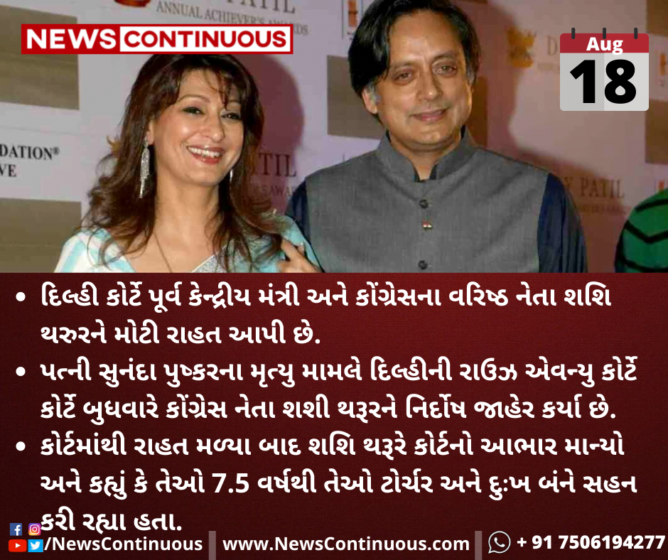 દિલ્હી કોર્ટે પૂર્વ કેન્દ્રીય મંત્રી અને કોંગ્રેસના વરિષ્ઠ નેતા શશિ થરુરને મોટી રાહત આપી છે.