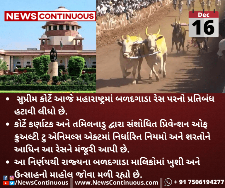 સુપ્રીમ કોર્ટે આજે મહારાષ્ટ્રમાં બળદગાડા રેસ પરનો પ્રતિબંધ હટાવી લીધો છે.