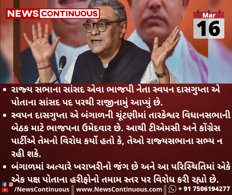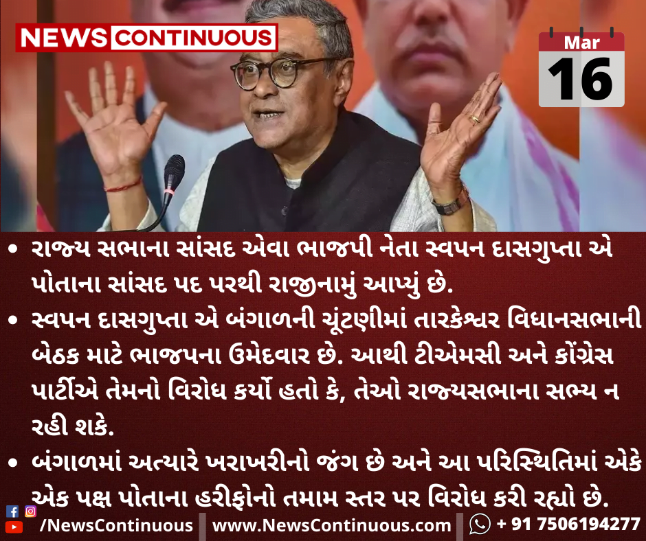 રાજ્ય સભાના સાંસદ એવા ભાજપી નેતા સ્વપન દાસગુપ્તા એ પોતાના સાંસદ પદ પરથી રાજીનામું આપ્યું છે.