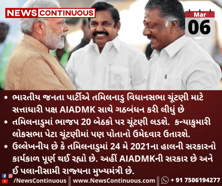 ભારતીય જનતા પાર્ટીએ તમિલનાડુ વિધાનસભા ચૂંટણી માટે સત્તાધારી પક્ષ AIADMK સાથે ગઠબંધન કરી લીધું છે