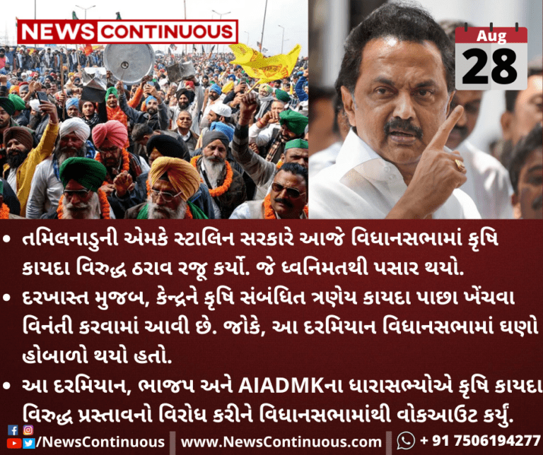 તમિલનાડુની એમકે સ્ટાલિન સરકારે આજે વિધાનસભામાં કૃષિ કાયદા વિરુદ્ધ ઠરાવ રજૂ કર્યો. જે ધ્વનિમતથી પસાર થયો.