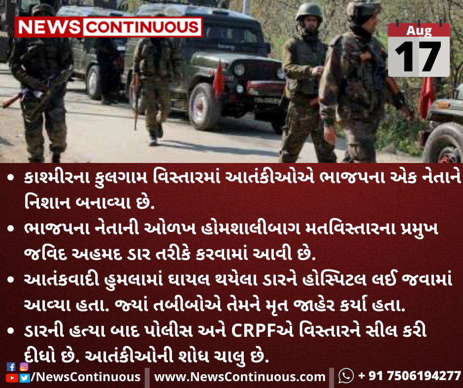 ભાજપના નેતાની ઓળખ હોમશાલીબાગ મતવિસ્તારના પ્રમુખ જવિદ અહમદ ડાર તરીકે કરવામાં આવી છે.