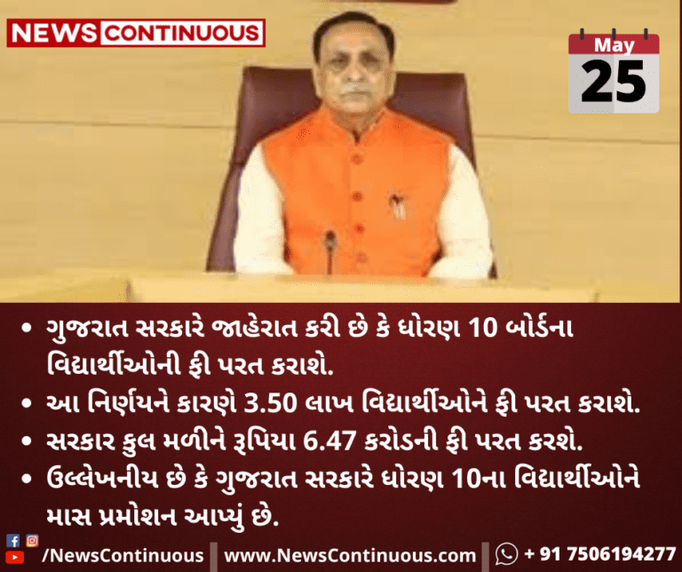 ગુજરાત સરકારે જાહેરાત કરી છે કે ધોરણ 10 બોર્ડના વિદ્યાર્થીઓની ફી પરત કરાશે.