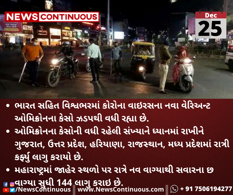 ઓમિક્રોનના કેસોની વધી રહેલી સંખ્યાને ધ્યાનમાં રાખીને ગુજરાત, ઉત્તર પ્રદેશ, હરિયાણા, રાજસ્થાન, મધ્ય પ્રદેશમાં રાત્રી કર્ફ્યુ લાગુ કરાયો છે.