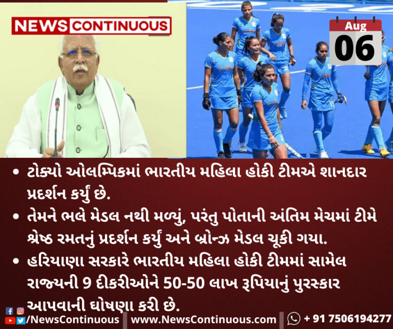 હરિયાણા સરકારે ભારતીય મહિલા હોકી ટીમમાં સામેલ રાજ્યની 9 દીકરીઓને 50-50 લાખ રૂપિયાનું પુરસ્કાર આપવાની ઘોષણા કરી છે.