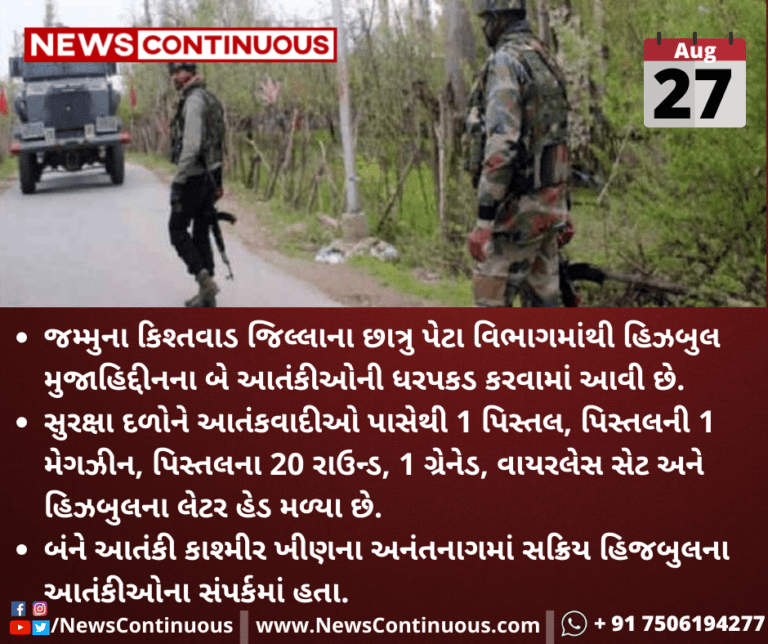 જમ્મુના કિશ્તવાડ જિલ્લાના છાત્રુ પેટા વિભાગમાંથી હિઝબુલ મુજાહિદ્દીનના બે આતંકીઓની ધરપકડ કરવામાં આવી છે.