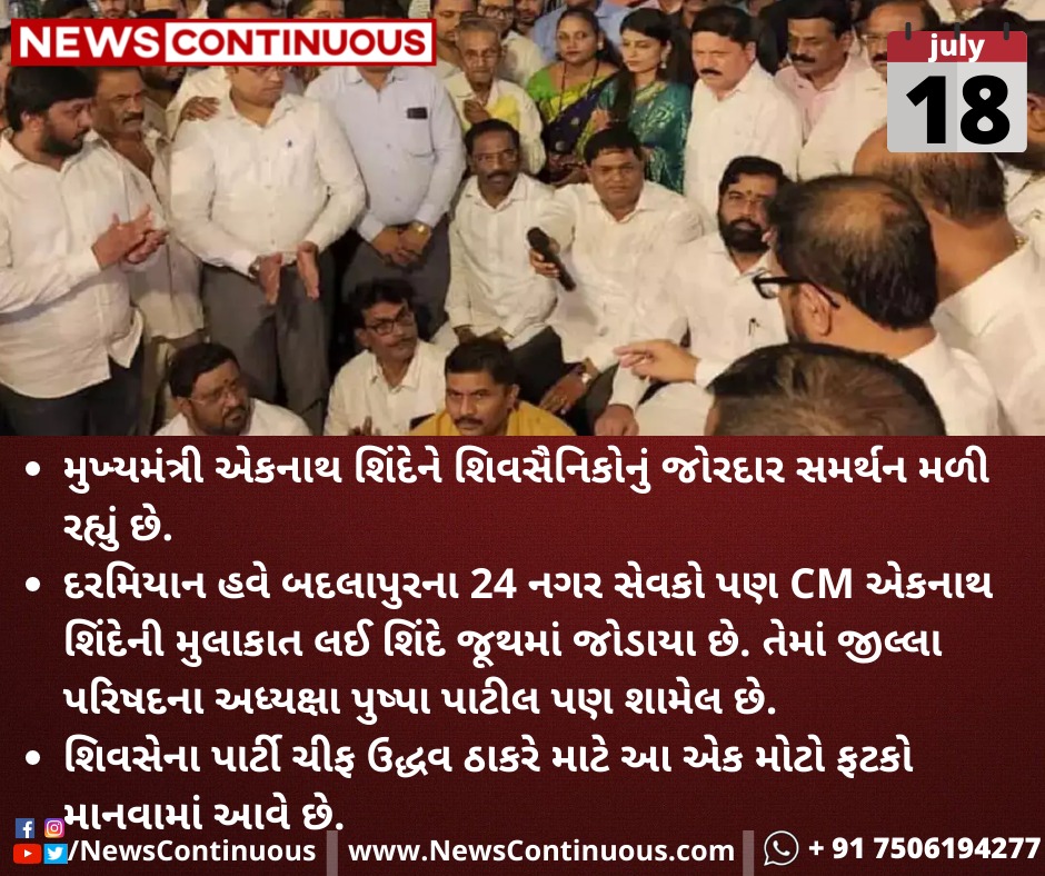 દરમિયાન હવે બદલાપુરના(Badlapur) 24 નગર સેવકો પણ CM એકનાથ શિંદેની મુલાકાત લઈ શિંદે જૂથમાં(Shinde Group) જોડાયા છે. તેમાં જીલ્લા પરિષદના અધ્યક્ષા પુષ્પા પાટીલ(Pushpa Patil) પણ શામેલ છે.