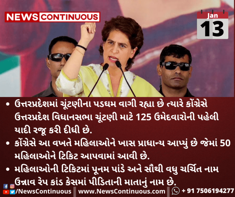 ઉત્તરપ્રદેશમાં ચૂંટણીના પડઘમ વાગી રહ્યા છે ત્યારે કોંગ્રેસે ઉત્તરપ્રદેશ વિધાનસભા ચૂંટણી માટે 125 ઉમેદવારોની પહેલી યાદી રજૂ કરી દીધી છે.