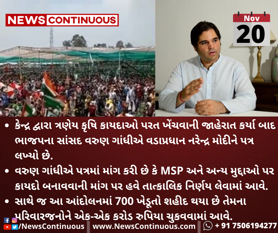 કેન્દ્ર દ્વારા ત્રણેય કૃષિ કાયદાઓ પરત ખેંચવાની જાહેરાત કર્યા બાદ ભાજપના સાંસદ વરુણ ગાંધીએ વડાપ્રધાન નરેન્દ્ર મોદીને પત્ર લખ્યો છે.