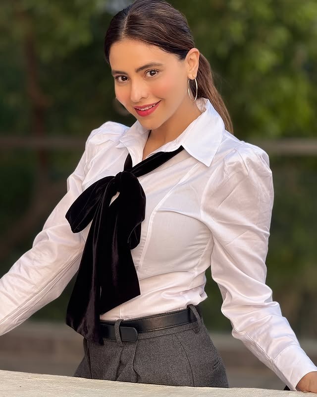 આ સાથે આમના એ બ્લેક કલર ની મોટી બો ટાઈ સ્ટાઇલ માં બાંધી છે