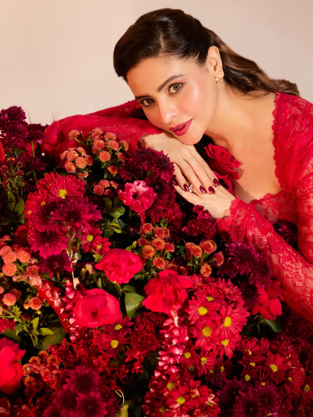 લાલ ગુલાબ ની સાથે લાલ ડ્રેસ માં આમના શરીફ ખુબ જ સુંદર લાગી રહી છે.