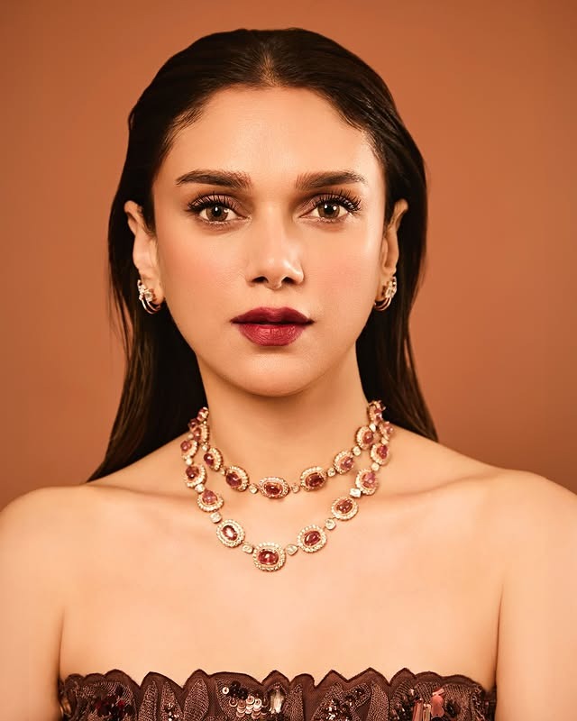 મેચિંગ આઈ મેકઅપ અને ડાર્ક લાલ લિપસ્ટિકથી અદિતિ એ પોતાનો લુક પૂર્ણ કર્યો છે.