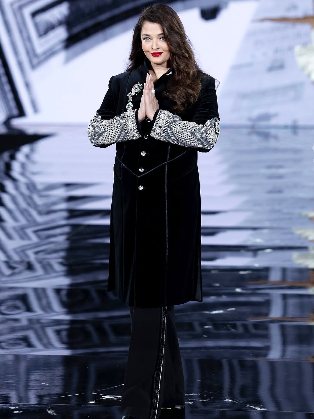 ઐશ્વર્યાના આઉટફિટમાં બોડી-હગિંગ સિલુએટ, ફુલ-લેન્થ સ્લીવ્ઝ, સાઇડ અને ફ્રન્ટ સ્લિટ્સ અને ફ્લેર પેન્ટ્સ પણ હતા, જે સુંદર રીતે ફોર્મલ ટચ આપતું હતું.