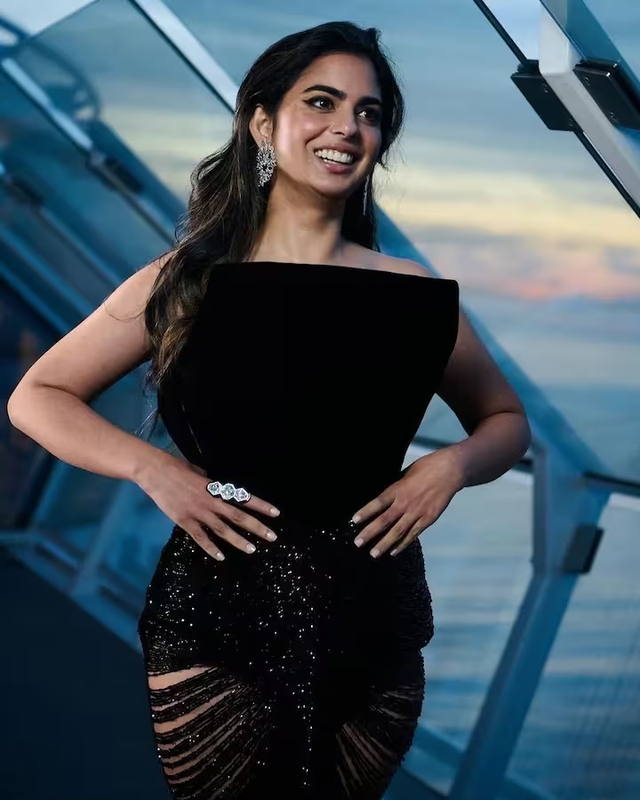 સ્ટેરી નાઈટ માટે ઈશા અંબાણી એ બ્લેક ઓફ શોલ્ડર ગાઉન સાથે ડાયમંડ જ્વેલરી થી પોતાનો લુક કમ્પ્લીટ કર્યો હતો