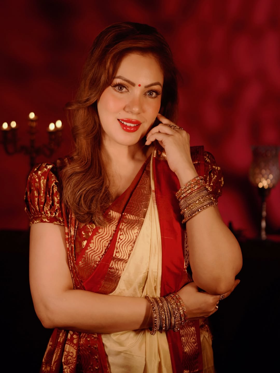 સોફ્ટ મેકઅપ, લાલ લિપસ્ટિક અને કપાળ પર નાનકડી બિંદી તેના ચહેરાની સુંદરતામાં ચાર ચાંદ લગાવી રહી છે
