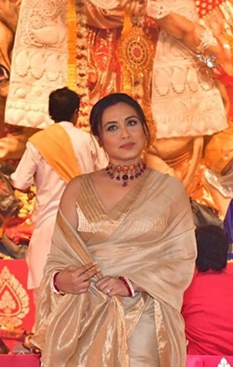 દુર્ગા પંડાલ માં રાની મુખર્જી ગોલ્ડન સાડીમાં જોવા મળી હતી. આ સાડી સાથે અભિનેત્રી એ ન્યૂડ મેક-અપ અને કોન્ટ્રાસ્ટ જ્વેલરી પહેરી હતી