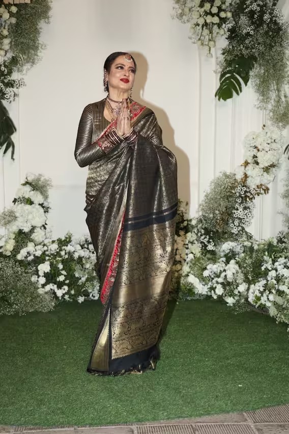 મનીષ મલ્હોત્રા ની દિવાળી પાર્ટી માં દિગ્ગ્જ અભિનેત્રી રેખા લાલ બોર્ડરવાળી ગોલ્ડન અને બ્લેક સાડી પહેરીને પહોંચી હતી.