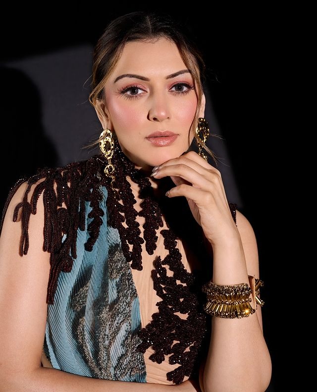 કાન માં મોટી ઇયરિંગ અને હાથ માં કડા સાથે હંસિકા એ તેના લુક ને એક્સેસરીઝ કર્યો છે.